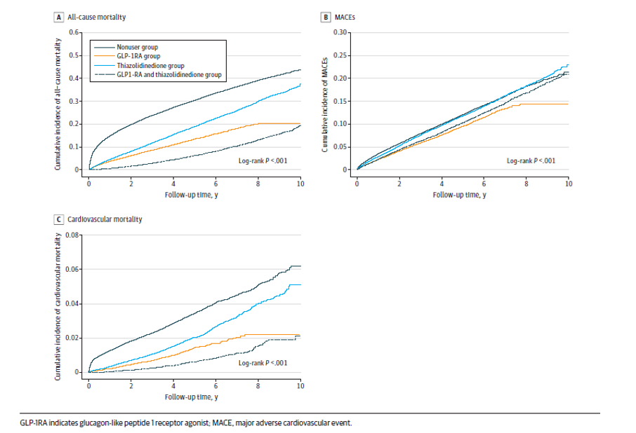 Os pacientes que receberam GLP-1RA mais tiazolidinediona apresentaram redução importante no risco de mortalidade por todas as causas (AHR 0,20; CI, 0.18-0.23; P < .001), eventos adversos cardiovasculares adversos (AHR 0,85; 95%CI, 0.82-0.89; P < .001) e mortalidade cardiovascular (AHR 0,20; 95%CI, 0.18-0.23; P < .001) em relação aos pacientes que não utilizaram GLP-1RA ou tiazolidinediona. No entanto, foi observado um maior risco de hipoglicemia em pacientes que receberam a terapia combinada (AHR, 1.61; 95%CI, 1.43-1.82; P < .001) e aqueles recebendo terapia com tiazolinediona (AHR, 1.69; 95%CI, 1.51-1.90; P < .001) comparada ao não uso. Esse efeito foi atenuado com uso prolongado. Pacientes em monoterapia com tiazolidinediona apresentaram risco aumentado de mortalidade por todas as causas (AHR, 1.29; 95%CI, 1.24-1.34; P < .001) e mortalidade cardiovascular (AHR, 1.28; 95%CI, 1.13-1.45; P < .001) em comparação com os pacientes em monoterapia com GLP-1RA. As análises de sensibilidade confirmaram a robustez desses achados.2