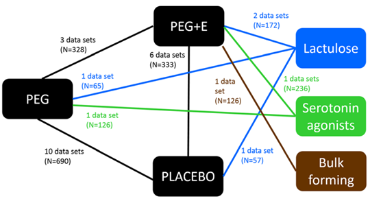 O estudo incluiu adultos com constipação funcional, incluindo casos de constipação crônica idiopática, associada a medicamentos, síndrome do intestino irritável ou doenças como Parkinson. No total foram incluídos 2247 pacientes, dos quais participaram de 19 ensaios clínicos randomizados (PEG N = 9, PEG + E N = 8, PEG versus PEG + E N = 2) avaliados, conforme Figura 1 mostrando um total de 26 conexões entre os comparadores.8