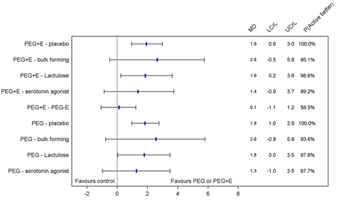 Os resultados mostraram que ambos, PEG + E ou PEG, aumentaram significativamente a frequência de evacuações por semana em comparação aos comparadores, sendo 1,8 (95% Crl 1,0, 2,8) e 1,9 (95% Crl 0,9, 3,0), respectivamente, versus o placebo, e em 1,8 (95% Crl 0,0, 3,5) e 1,9 (95% Crl 0,2, 3,6), respectivamente, versus lactulose. A comparação direta entre PEG + E e PEG não demonstrou diferença significativa na eficácia (−0,5; 95% Crl −4,5 a 3,3), conforme mostrado na Figura 2. Achado confirmado também pela análise em rede, que apontou diferença média insignificante entre PEG + E e PEG (0,1; 95% Crl −1,1 a 1,2) no número de evacuações por semana (Figura 3).8