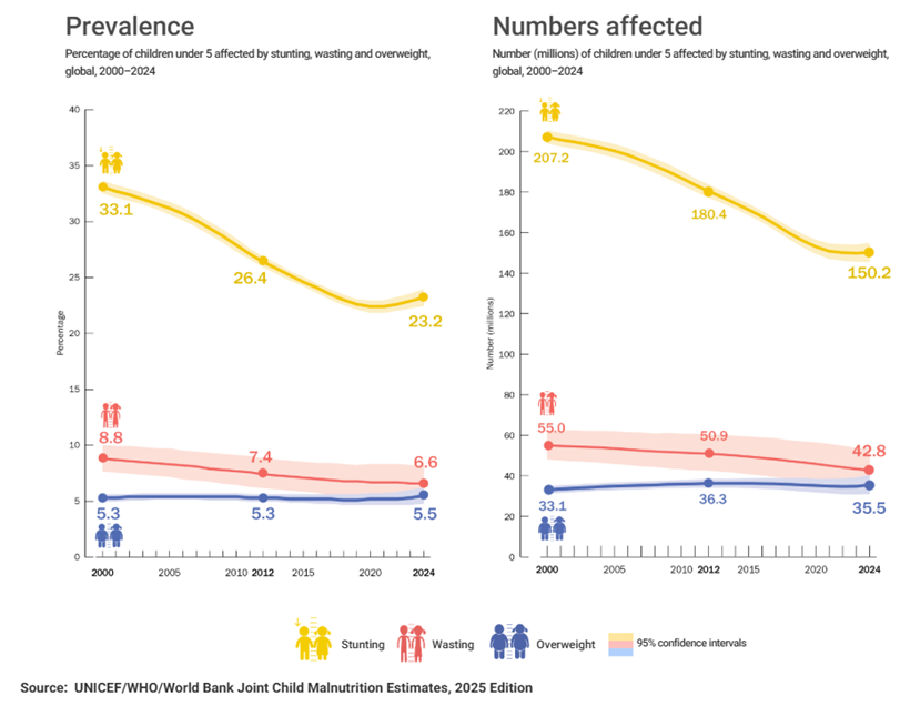 Figura 1: Evolução da desnutrição e excesso de peso em crianças menores de 5 anos (2000–2024) - dados globais do UNICEF/WHO/World Bank Joint Child Malnutrition Estimates – 2025 Edition²