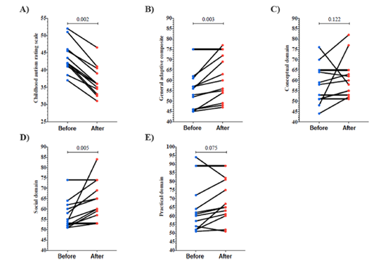 Figura 1: Resposta ao tratamento com óleo de Schizochytrium sp. marinho e complexo multivitamínico e mineral de participantes com TEA, avaliada pela escala ABAS-3. A) Escala de Avaliação do Autismo Infantil; B) Domínio Composto Adaptativo Geral; C) Domínio Conceitual; D) Domínio Social; E) Domínio Prático. Os dados são apresentados por dados brutos e pareamento entre antes e depois de 12 semanas de tratamento. A análise estatística aplicada foi o teste de postos sinalizados de Wilcoxon, que indicou a diferença estatística entre antes e depois do tratamento, considerando um erro alfa de 0,05. Fonte: Salmazo GF, et al., (2023)