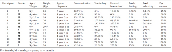 De acordo com a Tabela 1, todas as crianças apresentaram melhora na comunicação e no contato visual, além de ganhos adicionais em vocabulário, interação social, hábitos alimentares e redução da seletividade alimentar5.