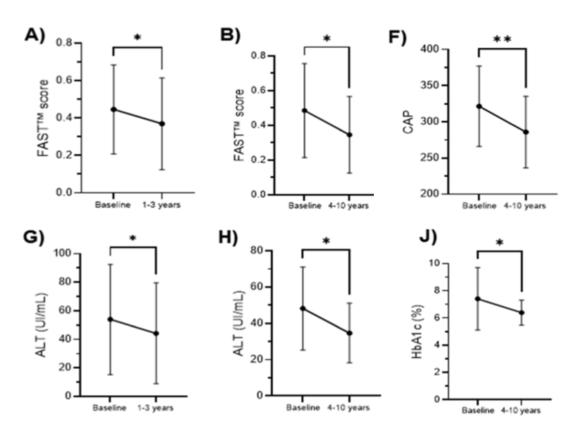 A análise longitudinal dos parâmetros de saúde desde o início do estudo até 1 a 3 anos e 4 a 10 anos revela alterações significativas nos principais biomarcadores, indicando melhorias nas enzimas hepáticas, esteatose hepática e controle glicêmico ao longo do tempo (Fig. 1).