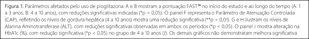 Melhora no controle glicêmico no período de 4 a 10 anos, destacando o duplo benefício da pioglitazona no tratamento de disfunções metabólicas e hepáticas.